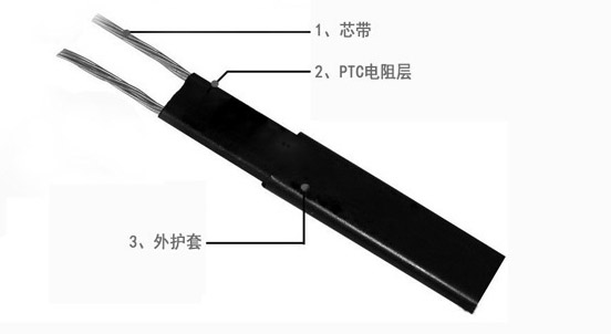 1、线芯; 2、导电塑料层:阻燃PTC; 3、绝缘层:阻燃聚烯烃